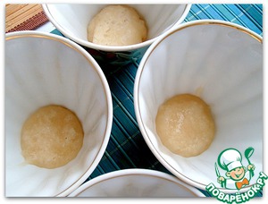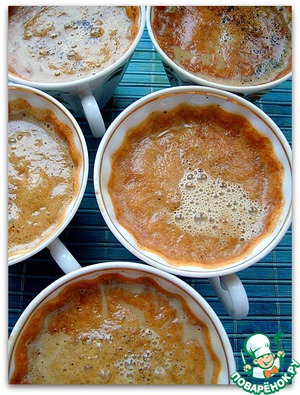 Добавляем к указанному количеству сахара 4 ст. л. холодной воды и варим карамель до полной однородности, но не добиваясь заметного потемнения. Заполняем карамелью дно чашек - примерно по 1,5 - 2 ст. л. в каждую.