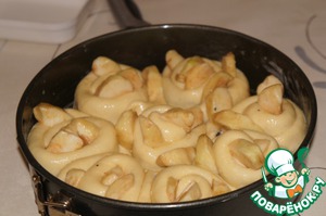 Получившиеся «цветочки» неплотно выложить в форму, смазанную жиром.