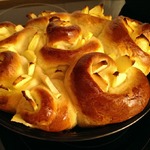 Затем, каждый рулет свернуть спиралью, вкладывая внутрь ломтики яблок.