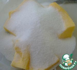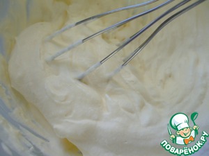 Взбить 100 граммов сливочного масла вместе с 70 гр сахара, щепоткой соли до пушистого, кремового состояния.