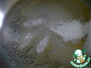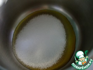 В большую кастрюлю насыпьте половину (около 50 граммов) сахара. Поставить на огонь и дождаться, когда он начнет таять. Добавить вторую половину и полностью карамелизовать сахар. Мешать нельзя, можно лишь время от времени потряхивать кастрюльку, чтобы сахар ровно распределился по поверхности.