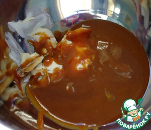Приготовить карамель на среднем огне всухую. Насыпать в сковороду или в сотейник с толстым дном 90 гр сахара, потряхивая сковороду за ручку, дождаться полного растворения сахара и приобретения карамели красновато-золотистого цвета... ложкой и лопаткой не мешать!!!). -