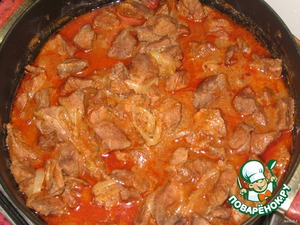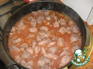 Мясо отжимаем от маринада и обжариваем на растительном масле до легкой румяности, вливаем маринад + томатный соус и тушим под крышкой на среднем огне до готовности (у меня получилось около часа).