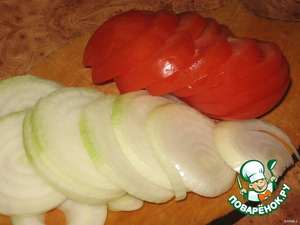 Лук и помидор нарезать кольцами, обжарить на растительном масле (с помидоров предварительно снять кожицу, обдав их кипятком).