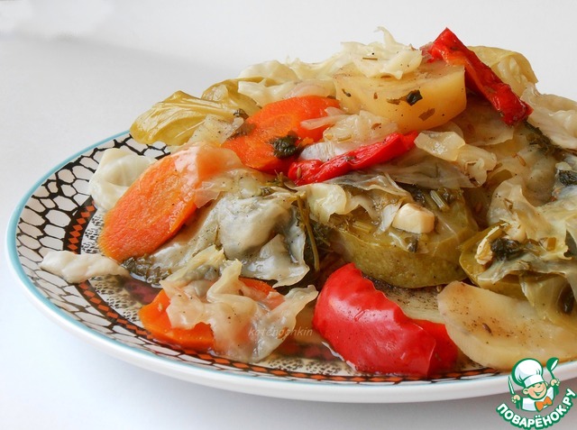 На верхний слой картофеля уложить слой болгарского перца (лучше использовать крупный красный, мясистый перец), приправить и снова закрыть всё капустными листьями.