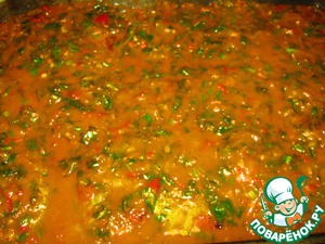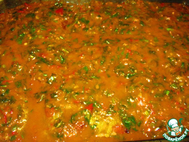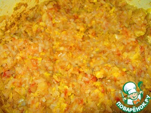 Оставшейся лук, морковь, красный болгарский перец натереть на мелкой тёрке, немного обжарить в растительном масле. Добавить томатную пасту и немного воды. Потушить 5 минут, добавить майонез и зелень, приправить.