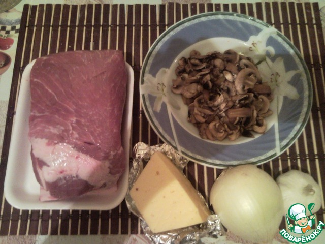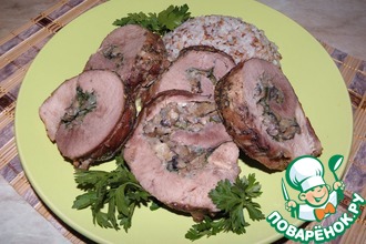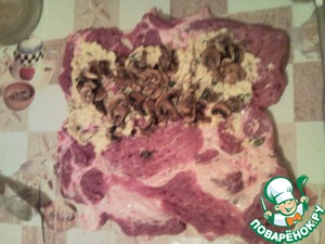 • Выкладываем нашу массу на мясо, кладём грибы и аккуратно сворачиваем.