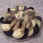 Наташ,принимай салат.Делала на НГ вместо "шубы" (а то как то она уже поднадоела). Всем понравилось. Заправку делала из красного хрена и сметаны(думаю особой разницы нет). Ну и салатные листья не использовала(просто забыла про них). Спасибочки за рецепт,буду делать и дальше. Главное,что быстро и не хлопотно.