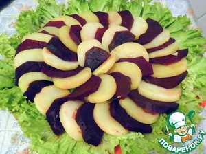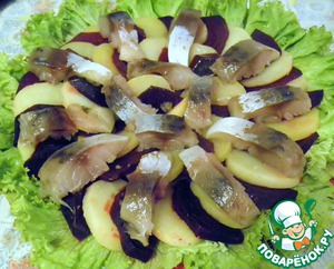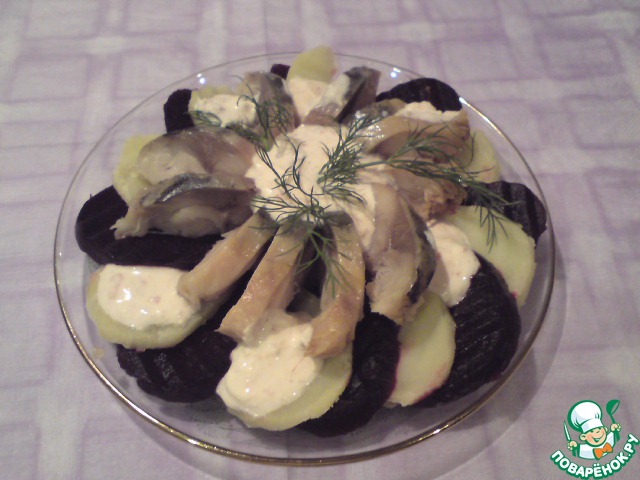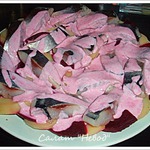 • Картофель и свеклу нарезать тонкими ломтиками. Картофель кружочками, свеклу в зависимости от размера и формы. Если небольшая или продолговатая, то тоже кружочками, если же крупненькая и пузатенькая, то лучше каждый кружочек разрезать пополам. Филе скумбрии нарезаем небольшими кусочками.