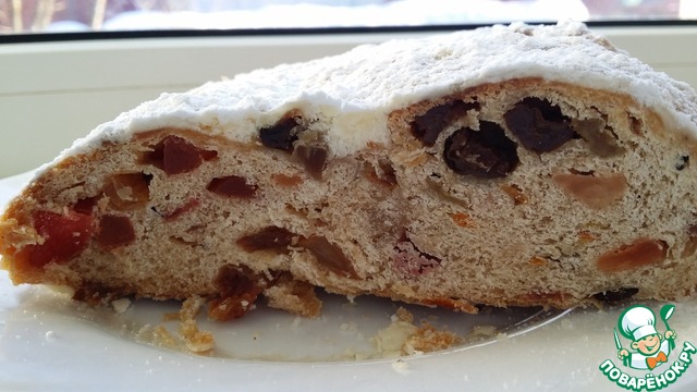 В остальном проблем с приготовлением не было. Честно сказать, не заметила я большой разницы между свежим штолленом и созревшим, возможно, я что-то не так сделала, все же пекла такое впервые, к тому же мне никогда не доводилось пробовать оригинальные штоллены. А может, дело в том, что цукатов и изюма было так много, что невозможно откусить тесто, не захватив кусочек начинки, и распробовать, настоялось ли оно.