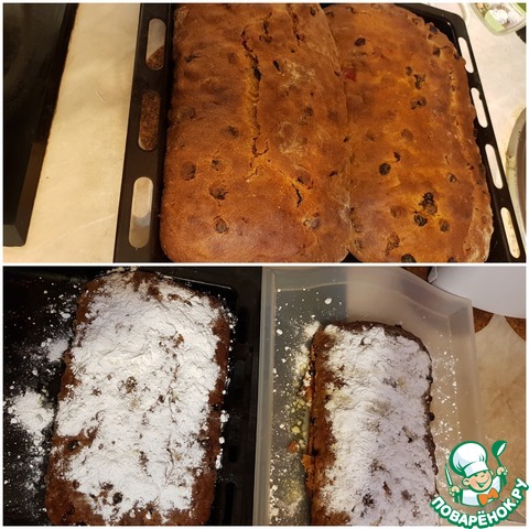Горячие (слегка остуженные) штолли тщательно смазать сливочным маслом и присыпать очень мелким сахаром, еще раз смазать маслом и обильно присыпать сахарной пудрой. -