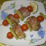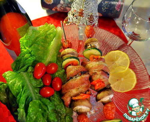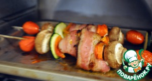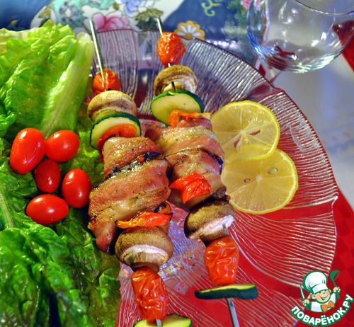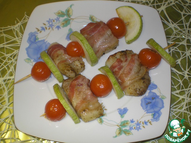 Нанизываем на шпажки чередуя куски рыбы, завернутые в бекон, грибы, перец и кабачки, и отправляем в духовку при 180-200 градусов. Бекон запекаясь начинат таять и пропитывает рыбу соком, а жир стекает вниз на протвень. Через минут 20 все готово.