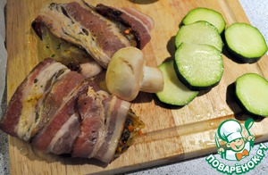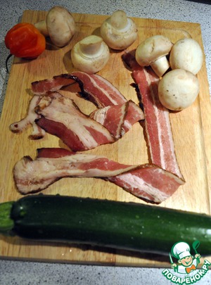 Рыбу порежем на порционные кусочки и каждй кусок завернем в ломтик бекона, порежеи кабачки (цуккини)