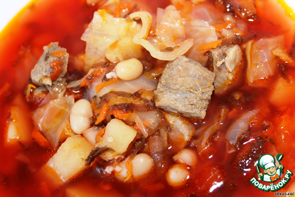 Поставить на огонь бульон. Картофель очистить, нарезать кубиками. Положить в кипящий бульон. Следом добавить нарезанную кубиками капусту. Когда картофель сварится, добавить все остальные овощи (свеклу, морковь и т. д.), фасоль, мясо, приправу. Варить еще 5 минут. Досолить и поперчить, если надо. Посыпать резаной зеленью. Подавать со сметаной, некоторые едят и без неё.