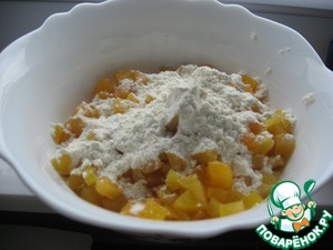 Порезать на кусочки. Смешать порезанные абрикосы с небольшим количеством муки (простой). -