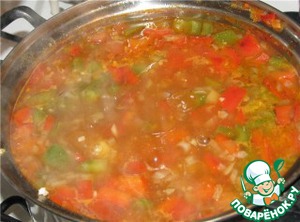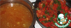 На средний огонь - перец обжариваем до мягкости вместе с измельчёнными помидорами. -