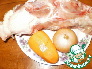 Сначала нужно сварить бульон. Для этого нужно промыть курицу, очистить морковь и вымыть лук.