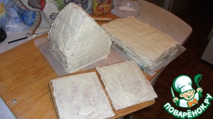 Для "дома" выпекаем точно также коржи форматом А4, Горячими режем пополам и убавляем с каждой стороны по полоске, чтобы получился квадрат. Обрезки коржей пойдут для заделки дома под крышей