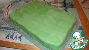 Для покрытия мастикой основания торта, раскатываем пласт толщиной 2-3 мм и больше основания (доску подпыляем крахмалом, для лёгкого раскатывания), чтобы края свисали на 5-10 см. переносим на торт, она очень хорошо ложится, аккуратно разравниваем руками и лишнее обрезаем.