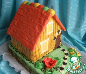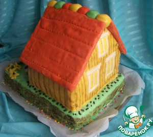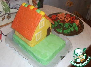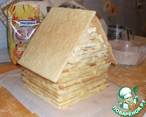 На основание торта ушло 4 коржа, верхний корж смазать слегка кремом, на него потом пойдет крем под мастику и ляжет сама мастика. Из обрезков теста выпечь ещё такой же корж и убрать (для крыши дома). Пусть основание стоит, пропитывается.