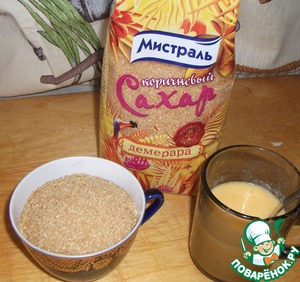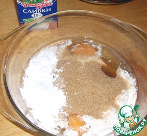 2 яйца растираем с 6 ст. л сахара Мистраль "Демерера" (110 гр), 2 ст. л муки и 1 ст. л крахмала. -