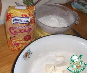 Высыпаем в миску 600 гр муки, 1 стак. сахара Мистраль, 0,5 ч. л соли, 0,5 ч. л соды - всё перемешать. Добавить кусочки размягчённого сливочного маргарина 400 гр (можно сливочное масло) и перетереть в крошку.