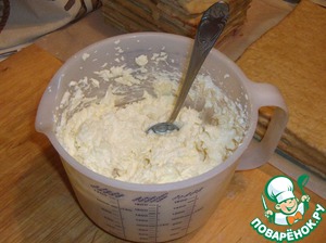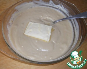 В горячий крем добавляем 100 гр сливочного масла и хорошо перемешиваем. Всё, крем для прослойки готов. Крема делала 2 порции (за 2 раза) -