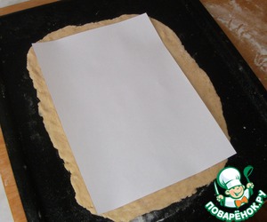 Достаём тесто, делим на 4 части. Одну часть раскатываем толщиной 3-4 мм, переносим на противень (его я не смазывала) и вырезаем по шаблону, у меня лист форматом А4. Это будет основание (поляна) для дома.