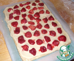 Так же через два коржа прокладываем кусочки клубники. Формируем дом и прикидываем крышу. Всё отставляем в сторону для пропитывания.