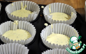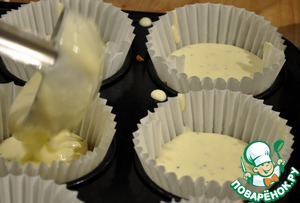 На основу в кажую формочку наливаем сливочную смесь, до половины формы, потому как смесь поднимется в духовке в 2 раза.