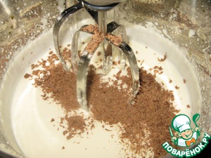 Сливки взбить с сахарной пудрой, добавить тёртый шоколад. Ещё раз взбить.
