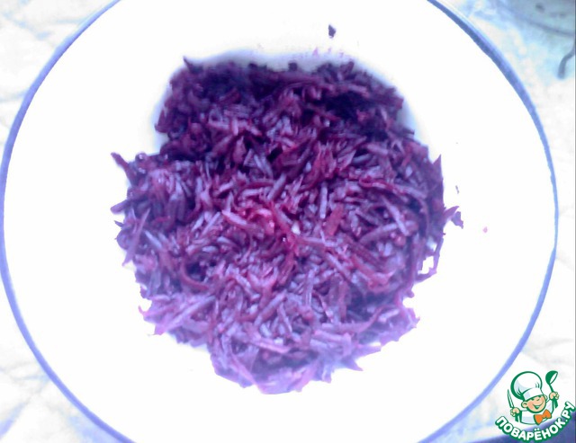 Свёклу и картофель отварить или запечь по отдельности. Остудить, очистить. Свёклу натереть на крупной тёрке.