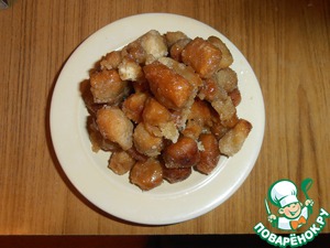 Нарезать на маленькие шарики. Обжарить в раскаленном масле до золотистого цвета.