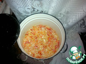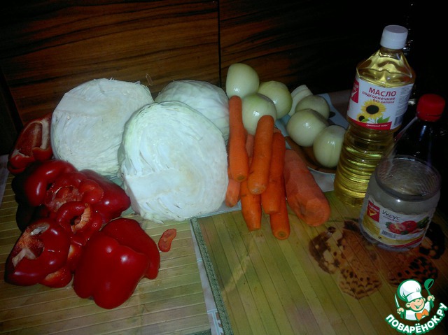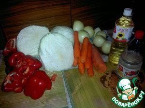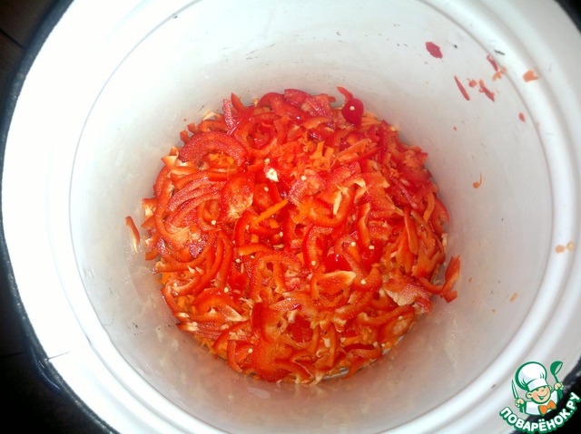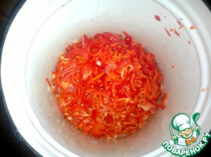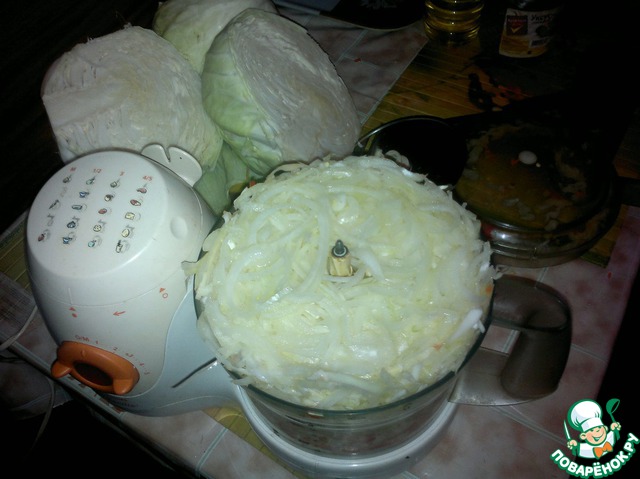 Лук и перец нарезаем полукольцами, я шинковал на комбайне, так же, как и капусту. Морковь натираем на крупной терке