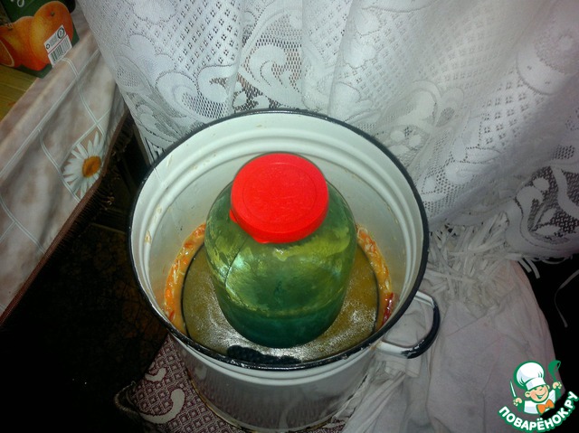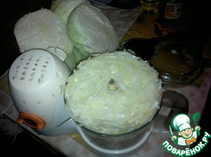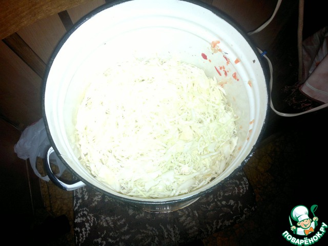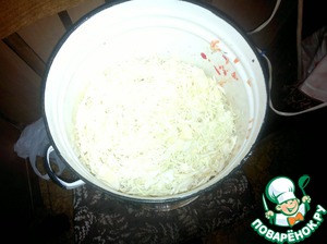 Перемешав все хорошо, уминаем деревянной толкушкой и ставим под пресс. В таком виде наша капусточка стоит в тепле три дня.