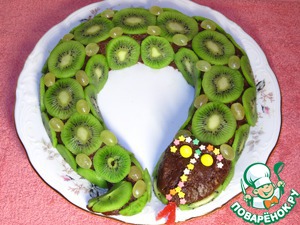 Украсить кусочками киви и винограда. Из конфеток драже сделать глаза. Украшать змея можно по своему усмотрению, как подскажет фантазия. Если же Вы украшаете кусочками фруктов, то лучше это сделать незадолго до подачи к столу, чтобы верх тортика "змея" не подмок.