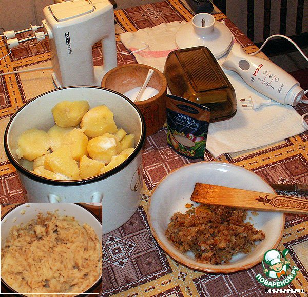 Картофельная. Варим очищенную картошку желательно на пару (так вкуснее!), толчем ее, засыпаем солью, перцем, добавляем сливочное масло и поджаренный лук, и ставим это пюре охлаждаться.