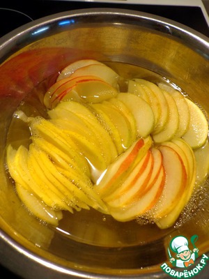 Приготовить сироп: в кипящую воду добавить сахар и лимонный сок. Поварить яблоки 2 минуты. Воду слить... ну, как воду, хороший такой компот получается, так что можно и выпить )))