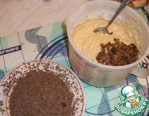 Добавить 100 г изюма и тёртого на крупной тёрке 100 г шоколада. Всё хорошо перемешать.