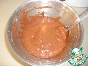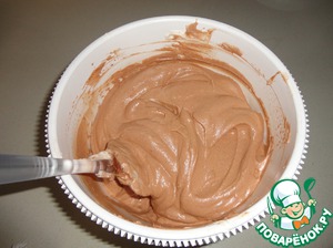 Затем потихоньку добавляем просеянную муку с какао и разрыхлителем. Выключаем миксер.