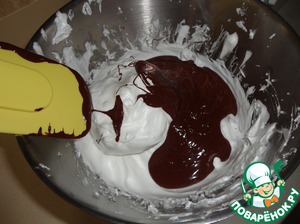 Теперь в еще теплую меренгу добавляем растопленный шоколад и перемешиваем шпателем.