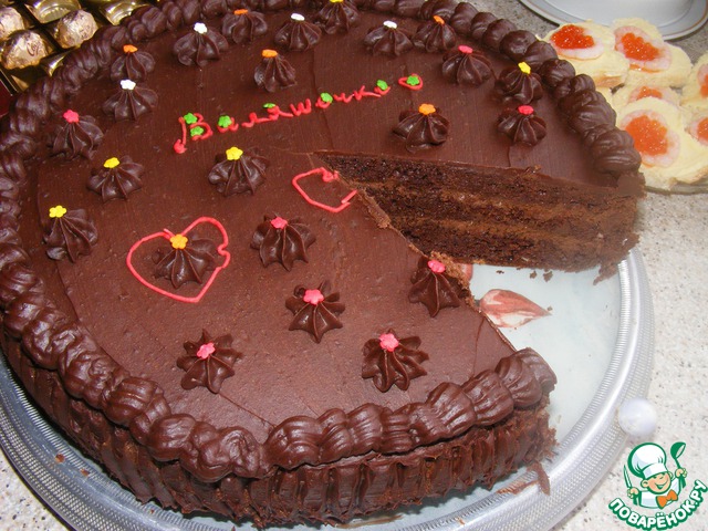 Далее подогреваем сливки (200мл) и заливаем ими шоколад (200гр), поломанный на мелкие кусочки. Оставляем на несколько минут, чтоб шоколад растопился и перемешиваем до однородной консистенции. Когда ганаш остынет и "потяжелеет", заливаем им всю поверхность торта. Украшаем шоколадом. -