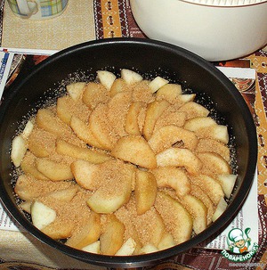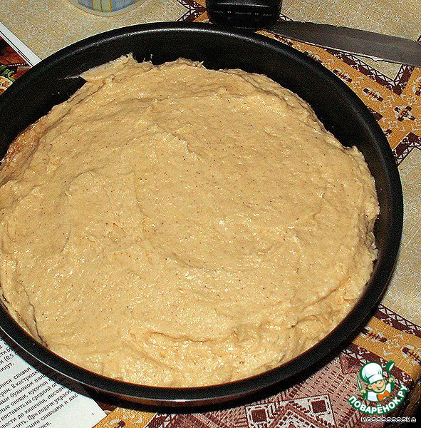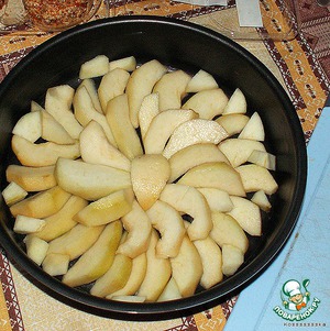 Форму для выпечки смазываем маслом, кладем красиво дольки груш,