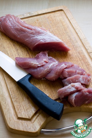 Замариновать мясо в соусе Kikkoman Teriyaki на 2 часа. К сожалению, я поздно обнаружила, что этот соус у меня закончился, поэтому мариновала в соусе для жарки Kikkoman Sukiyaki. Забегая вперед, скажу - очень понравилось! Восхитительный результат!