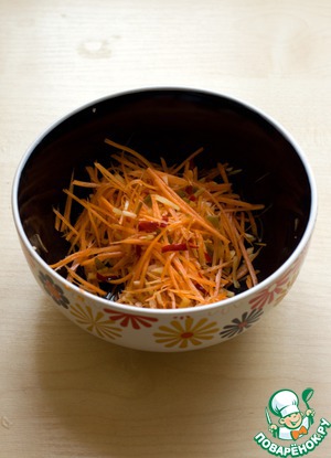 Морковь смешать с чили, чесноком и имбирем, перемешать, оставить мариноваться.