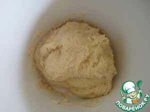 Затем добавляем 1 яйцо + 1,5 ст. л. коричневого сахара + 1/4 ч. л. соли + ванилин - перемешали, добавили 3,5 ст. муки и замесили тесто. Муки больше не надо!!! Тесто чуть прилипает!