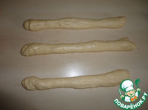 Делим тесто на 3 равные части. Раскатываем колбаской для удобства. Мукой не пользуемся!!! Если вдруг у вас снова немного прилипает, смажьте ручки капелькой растительного масла. Тесто нежное, эластичное, очень хочется с таким работать.