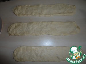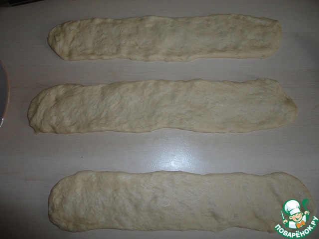 Растягиваем руками в стороны, получили три длиные плоские лепёшечки.
