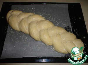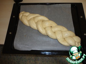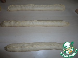 Выкладываем на противень, застеленный пергаментом и смазанный чуть-чуть растительным маслом. Формируем из колбасок чудо-косу. Заплетаем слабо!!! ставим на 20 мин. в тёплую духовку