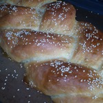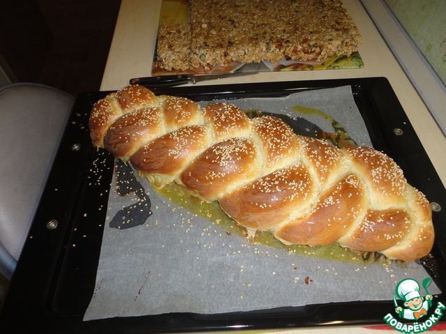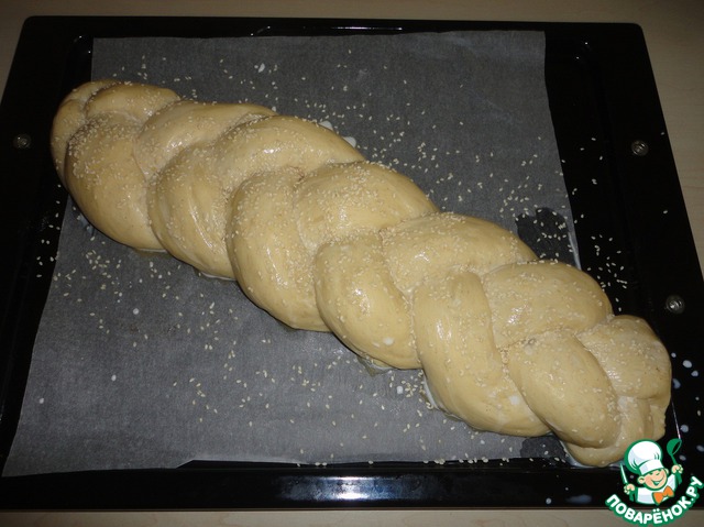 Достаём. Духовку снова включаем на 180*С. Смазываем косу молоком, посыпаем кунжутом (кунжут не обязательно)